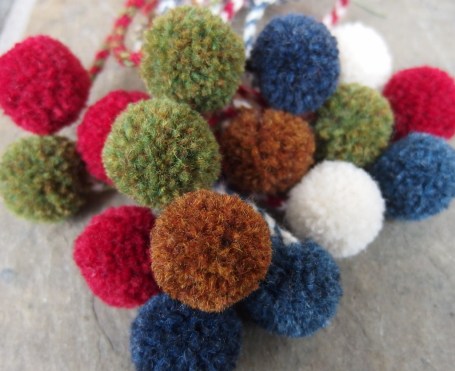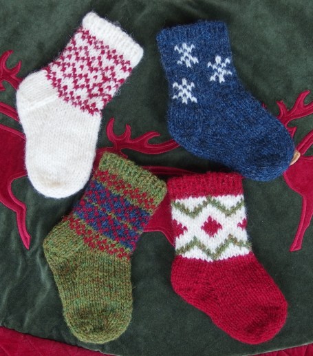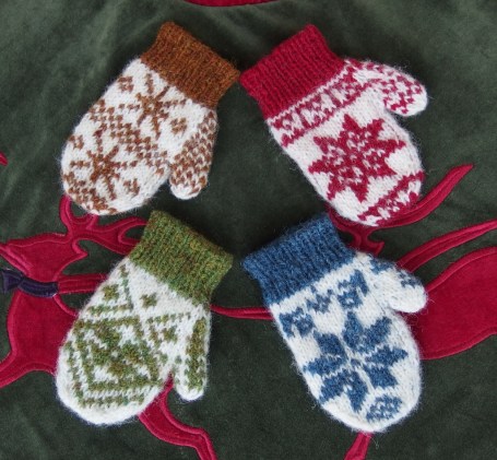 A garland of mittens and stockings, her eyes lit up, I picked two kits and she customized them by swapping yarn colors so the two kits would coordinate better.
