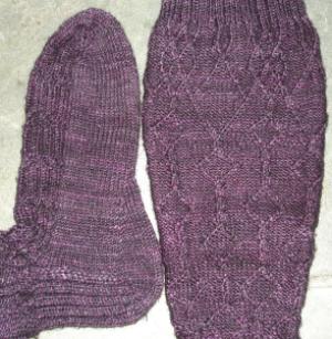 A toe up pattern with a clever attractive heel, it makes me smile to think of it. The cable design is pretty and skillfully adapted for knitting in the round.